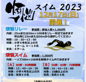 昨日は毎年恒例のイベント、煩悩Swimに参加。煩悩スイムとは、50メートルを煩悩の数108本を泳ぐイベントです。今年は長男と教え子の中学生たちを引き連れて8人で参戦してきました。今回は全体的な参加人数が少ないということも […]